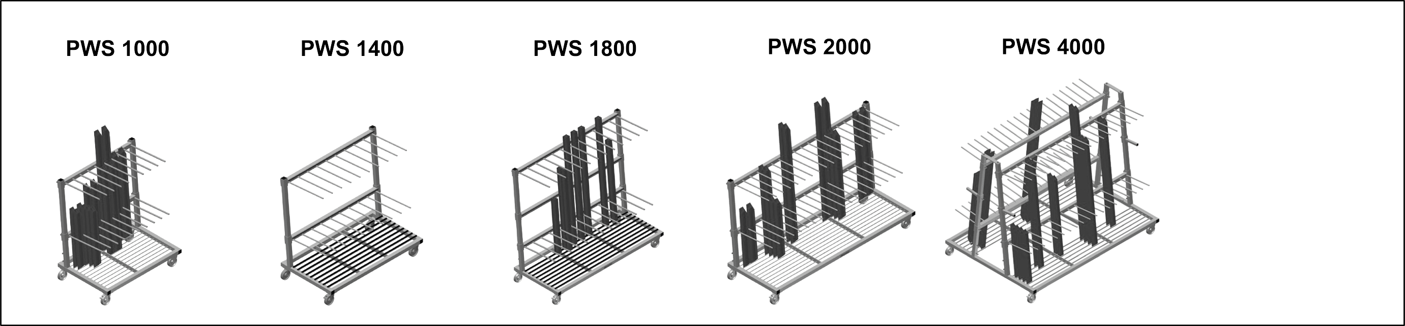 PWS 1400: Vertical profile transportation. Sufficient for 30-40 profile bars. Lower supporting surface with rubber strips. Compartment dividers with protective tubing. Rear back support with rubber strips.