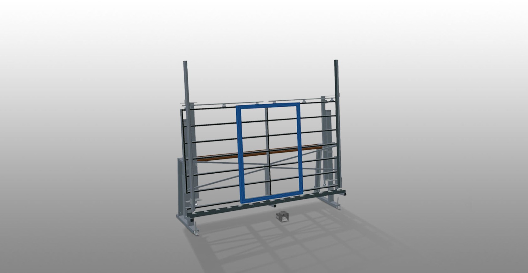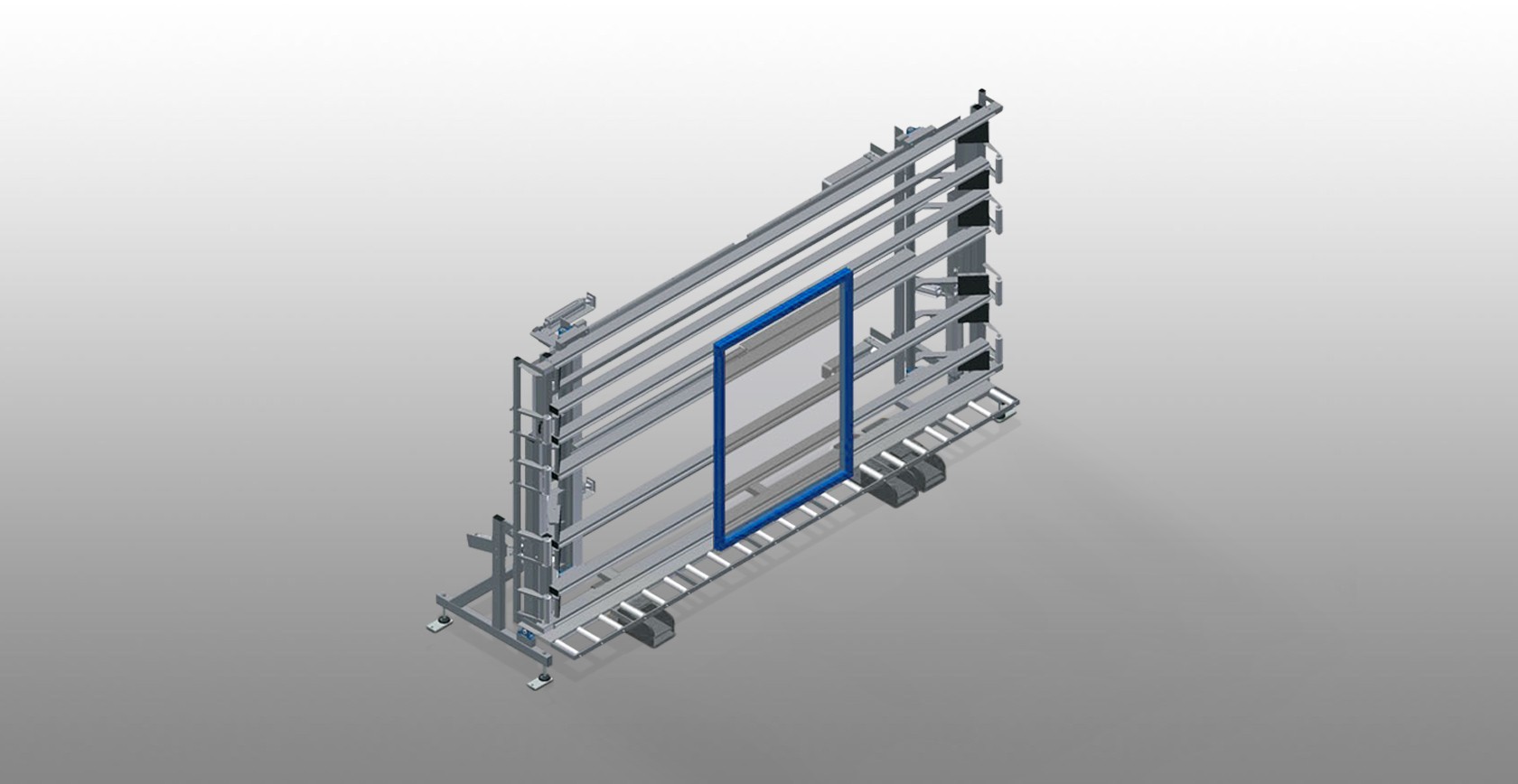 Inspection and glazing unit for glazing and final inspection in individual and serial assembly line production. Quick and precise assembly of windows, doors and elements. Stable steel construction. Easy operation by means of foot switch.