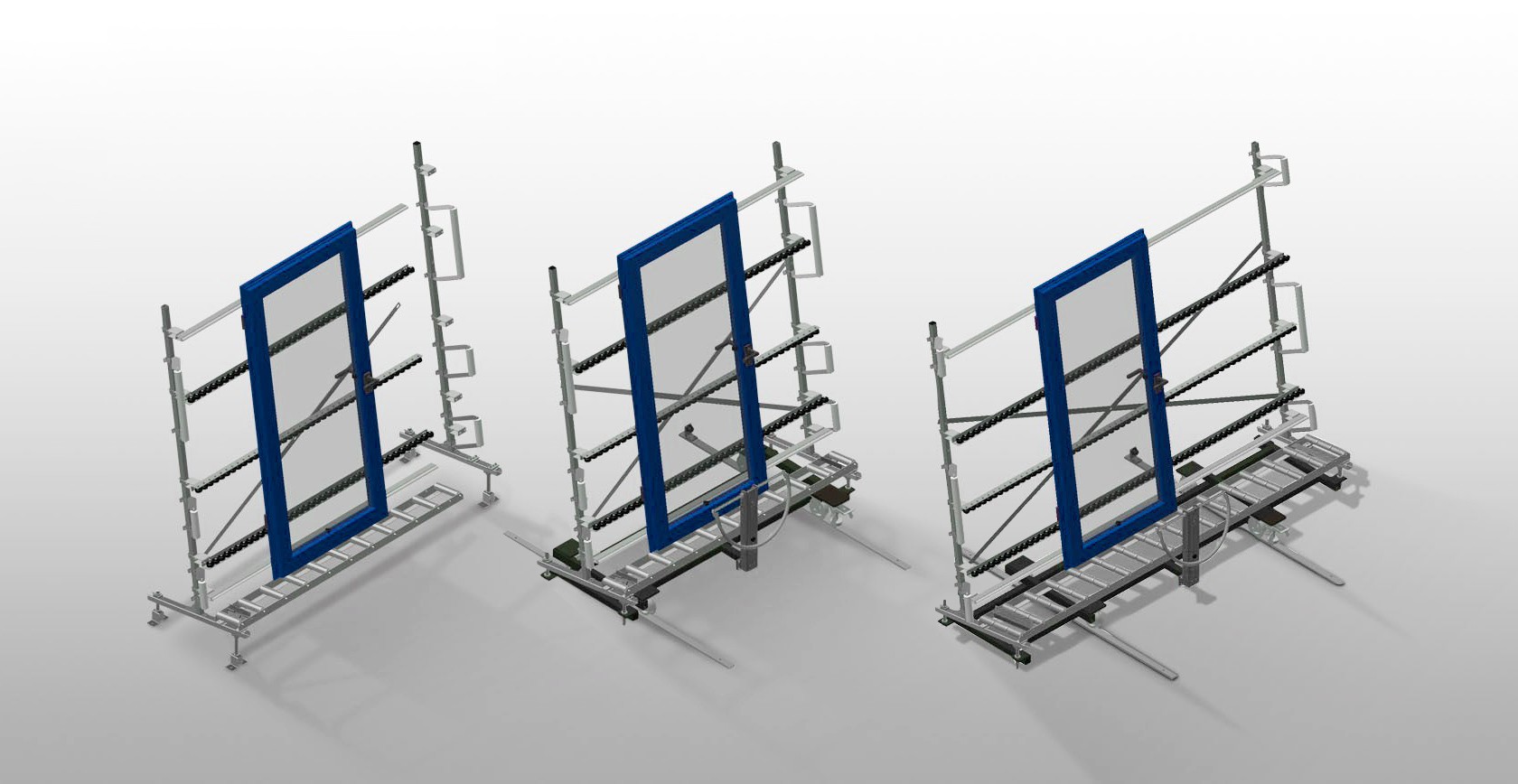 Pionowy podajnik rolkowy przeznaczony do transportu elementów do kolejnej obróbki oraz do transportu lub magazynowania i sortowania gotowych okien. Wygodne pozycjonowanie elementów okiennych.