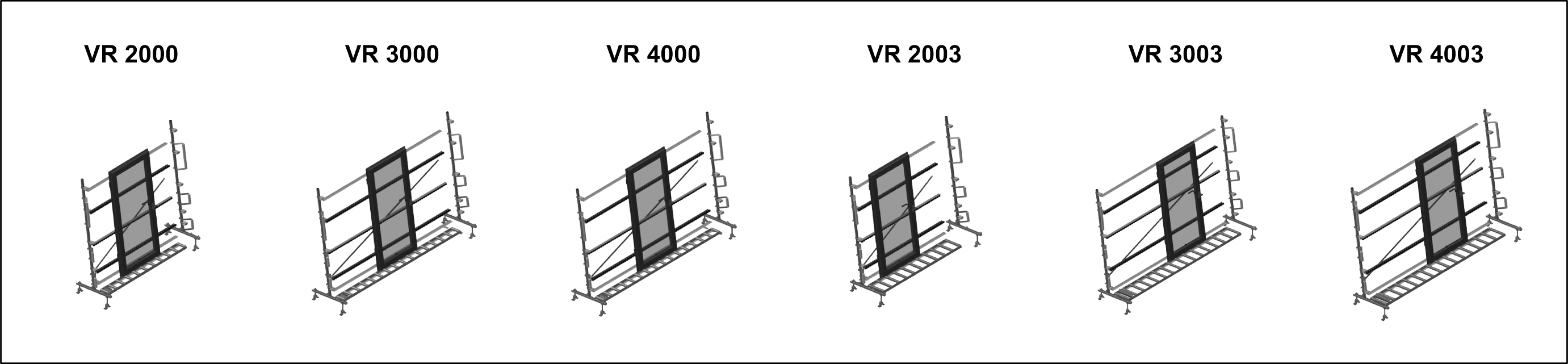 VR 2000 / VR 3000 / VR 4000 / VR 2003 / VR 3003 / VR 4003: Możliwość rozbudowy w systemie modułowym. Każdy zespół podajnika rolkowego o długości 2.000/3.000/4.000 mm (zgodnie z modelem). Listwy ślizgowe z tworzywa sztucznego, góra i dół. Trzy listwy rolkowe z rolkami gumowymi, średnica 50 mm. Jednostka podstawowa bez podpory końcowej.