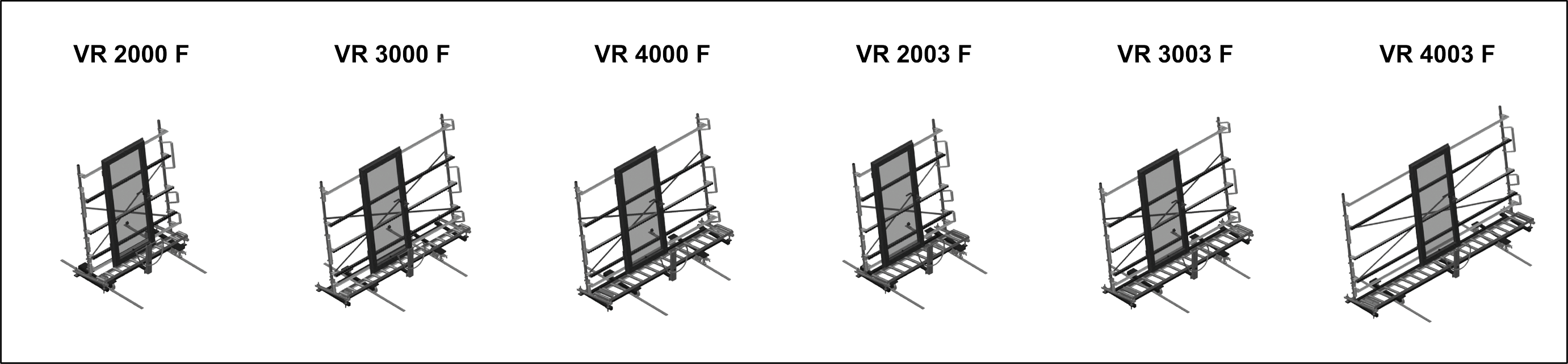 VR 2000 F / VR 3000 F / VR 4000 F / VR 2003 F / VR 3003 F / VR 4003 F: Każdy zespół podajnika rolkowego o długości 2.000/3.000/4.000 mm (zgodnie z modelem). Listwy ślizgowe z tworzywa sztucznego, góra i dół. Trzy listwy rolkowe z rolkami gumowymi, średnica 50 mm. Jednostka podstawowa z podporą końcową. Pionowy podajnik rolkowy na szynach z kółkami jezdnymi, przesuwny.