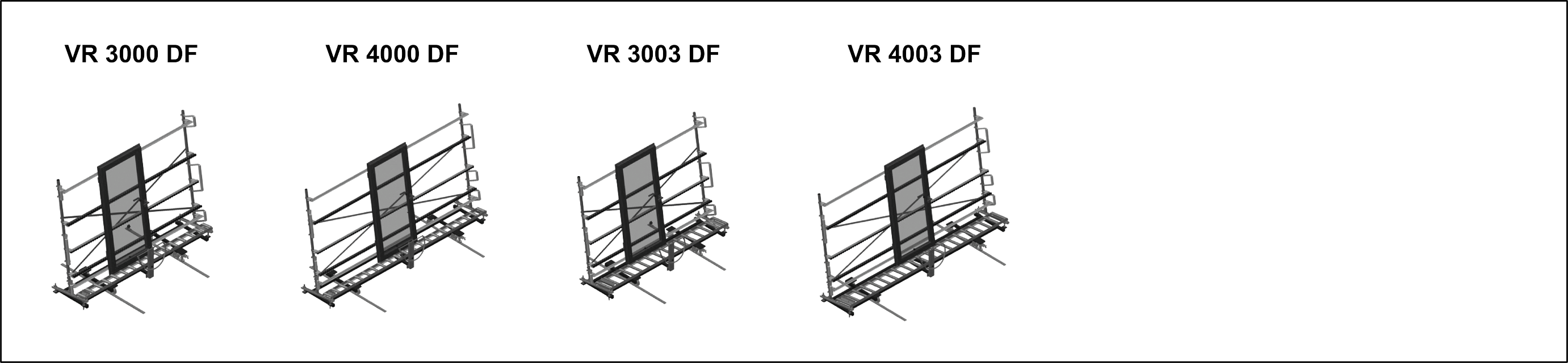 VR 3000 DF / VR 4000 DF / VR 3003 DF / VR 4003 DF: Każdy zespół podajnika rolkowego o długości 3.000/4.000 mm (zgodnie z modelem). Listwy ślizgowe z tworzywa sztucznego, góra i dół. Trzy listwy rolkowe z rolkami gumowymi, średnica 50 mm. Jednostka podstawowa z podporą końcową. Pionowy podajnik rolkowy na szynach z kółkami jezdnymi, przesuwny. Podajnik rolkowy można obracać o 360°.