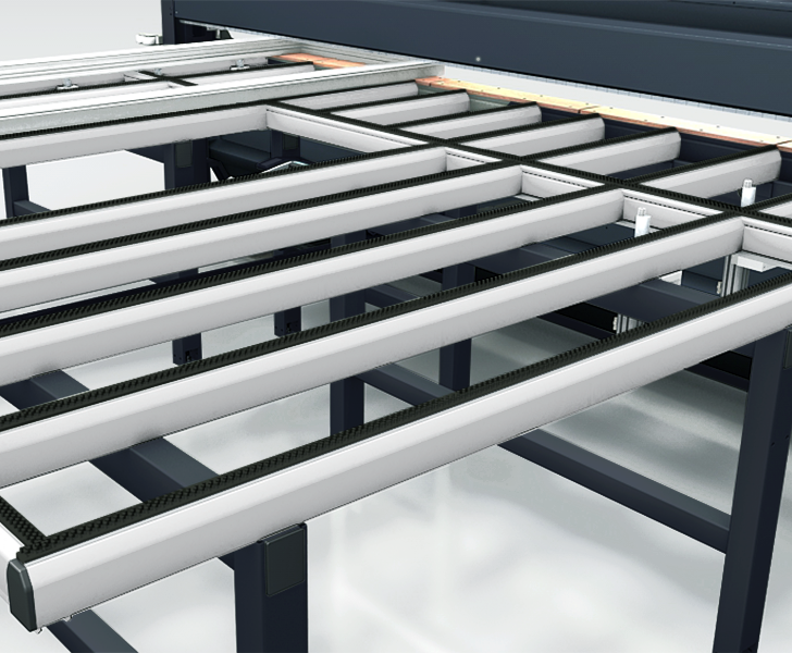 The work bench is very wide and customisable to allow the translation of even large formats. Upon request it is equipped with pneumatic bench exchange to enable on the same bench also the assembly of windows.