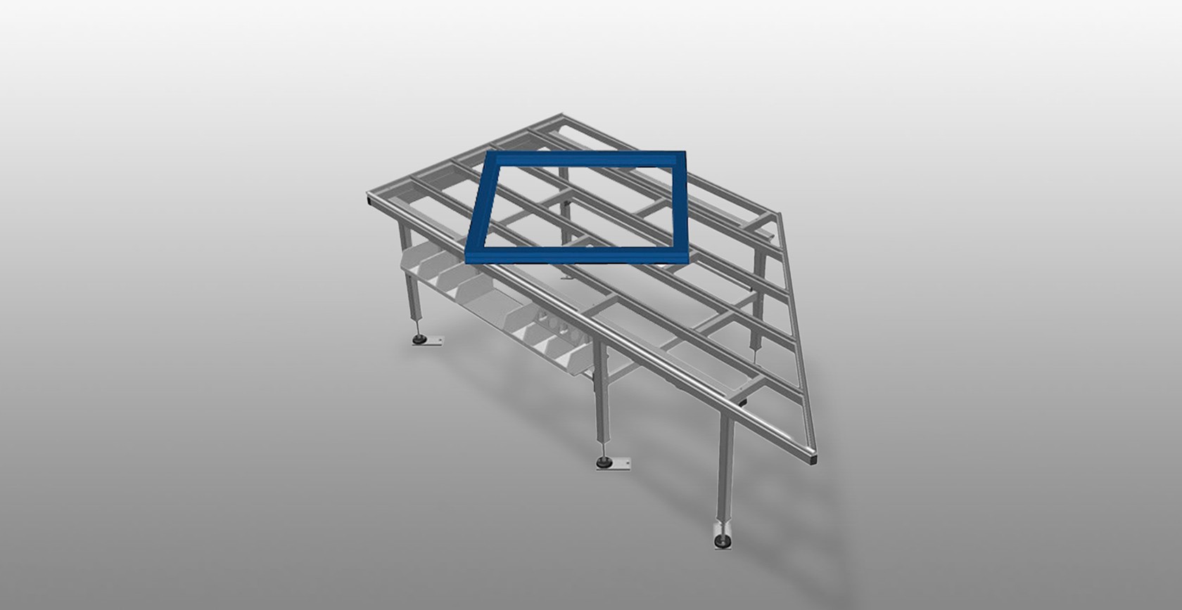 Stół poziomy przeznaczony do wszystkich prac na ramach i skrzydłach. Stabilna konstrukcja stalowa. Stół roboczy z poprzeczką, stosowany jako stół przelotowy w linii produkcyjnej lub w strefie buforowej. Stół montażowy przeznaczony do wszystkich prac na ramie i skrzydle. Powierzchnia robocza: listwy ślizgowe z tworzywa sztucznego. Półka narzędziowa do odkładania akcesoriów i narzędzi. Regulowany w pionie. Łatwy montaż w systemie modułowym.