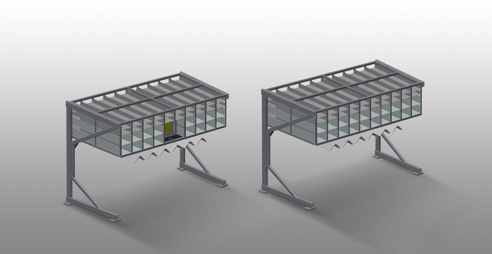 Scaffale ferramenta con 36/40 scomparti per il riponimento ordinato delle ferramenta sulla postazione di montaggio delle ante. Solida struttura in acciaio. Con sei supporti angolari per testate di rinvio angolari.