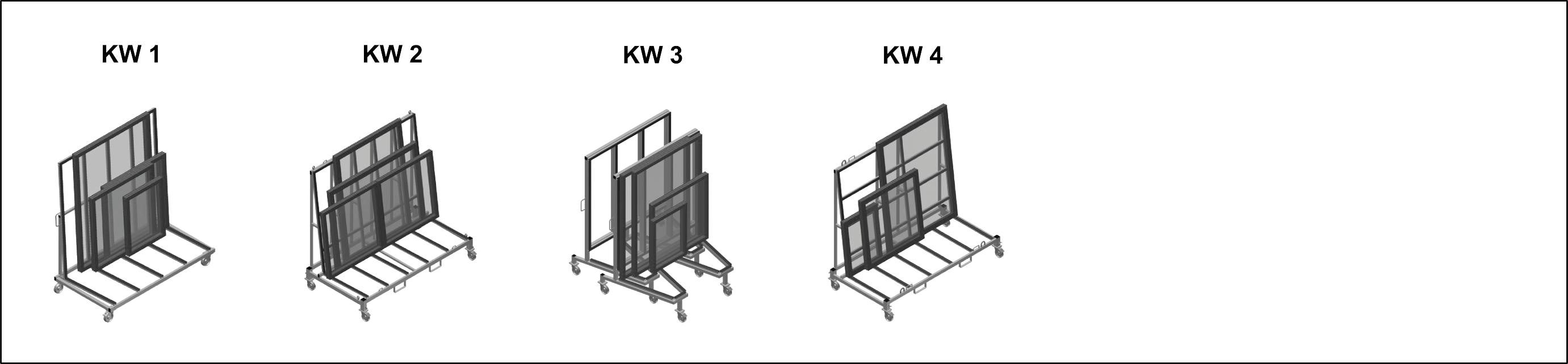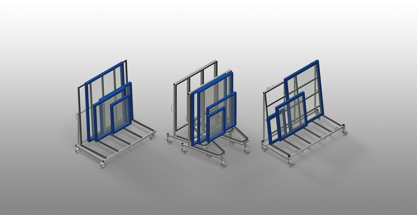 Carrello di lavoro per il trasporto interno all'azienda degli elementi di finestra. Solida struttura in acciaio. Supporto del profilo con rivestimento in gomma. Quattro ruote orientabili, due delle quali con freno fisso.