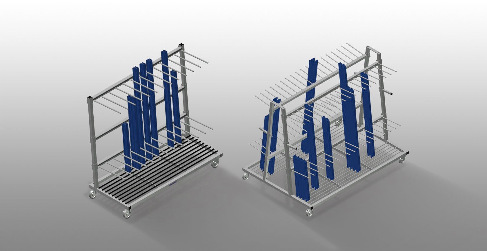 Carrello per l’immagazzinaggio verticale e il trasporto di profili. Solida struttura in acciaio. Ideale per il trasporto e l'immagazzinaggio temporaneo di ingombro ridotto di ritagli di profili. Facili operazioni di carico e scarico. Separatori regolabili in altezza. Quattro ruote orientabili, due delle quali con freno fisso.