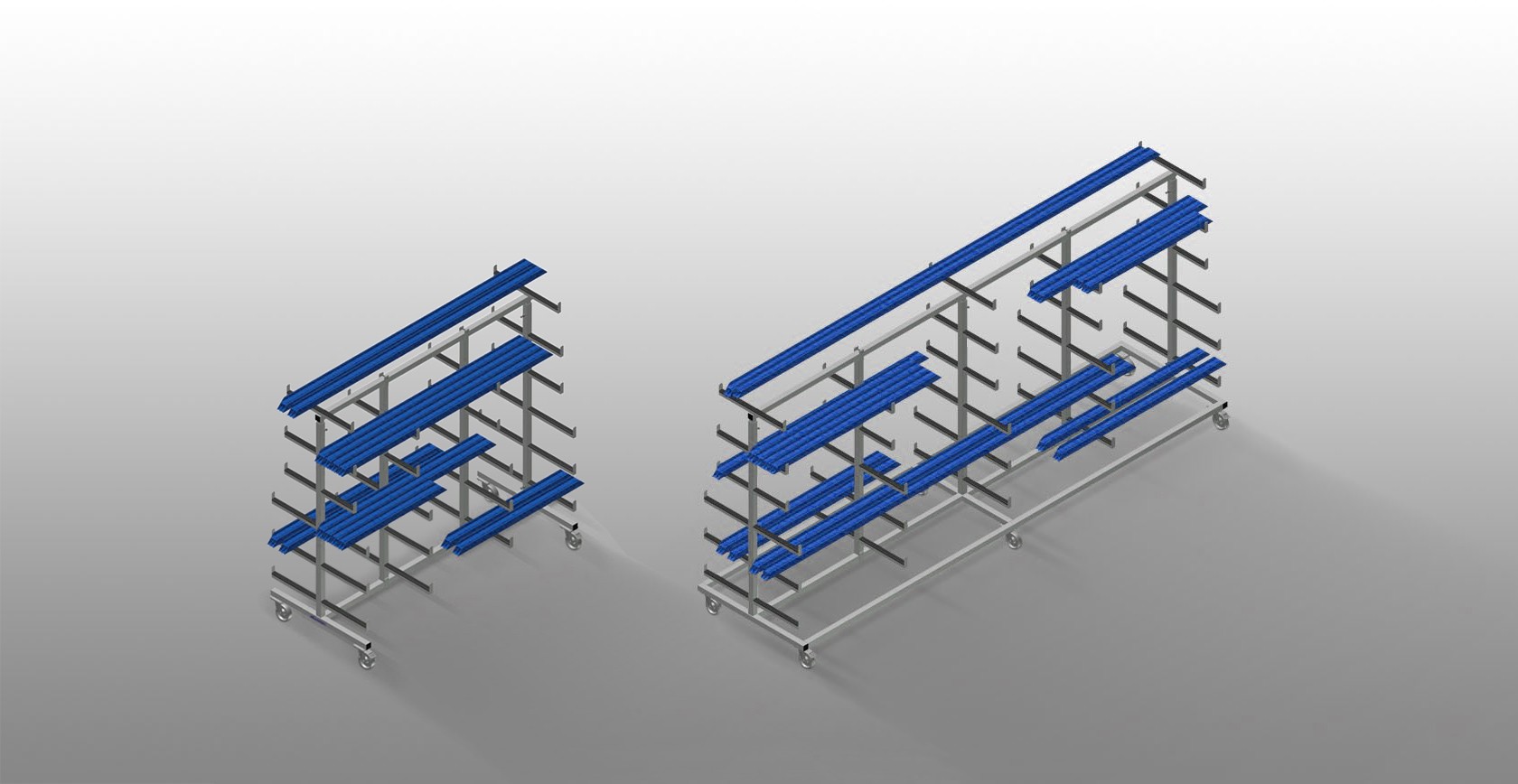 Wózek do poziomego składowania i transportu profili. Stabilna konstrukcja stalowa. Poziomy transport profili. Łatwy transport profili przyciętych na wymiar. Ramiona nośne pokryte gumą. Wózek do profili z obustronnymi wspornikami. Sześć wsporników na słupek.