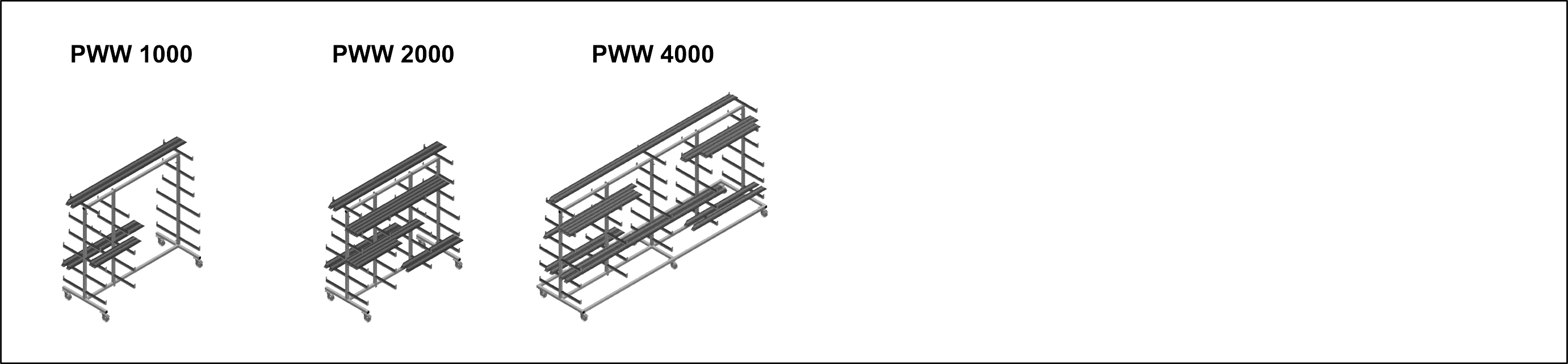 PWW 1000: Jeden wspornik środkowy. Cztery kółka, z których dwa z blokadą.